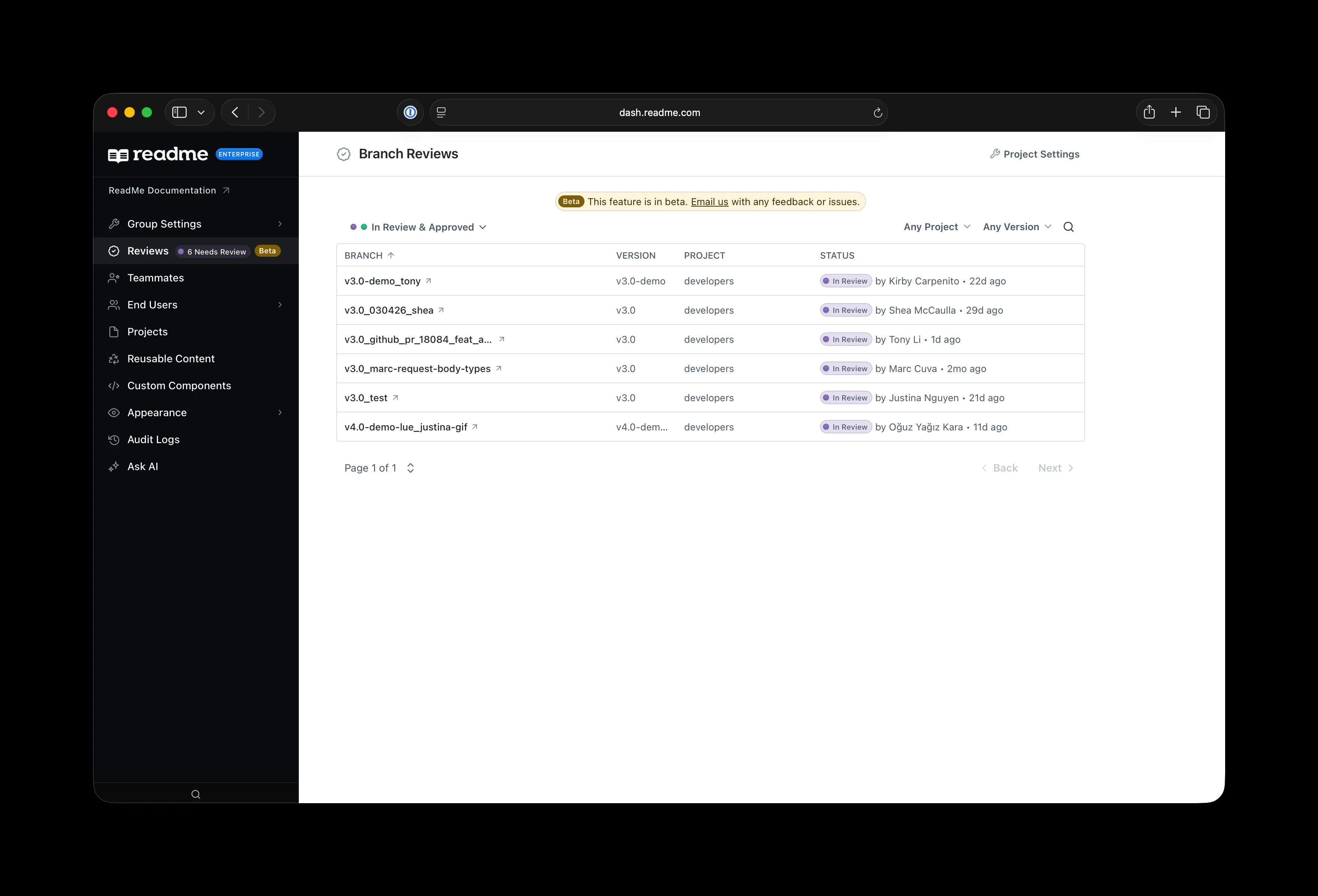 Group Editors & Admins can access the Reviews page to see branches that require review across all projects. They can search and filter for the projects that are of note to them.
