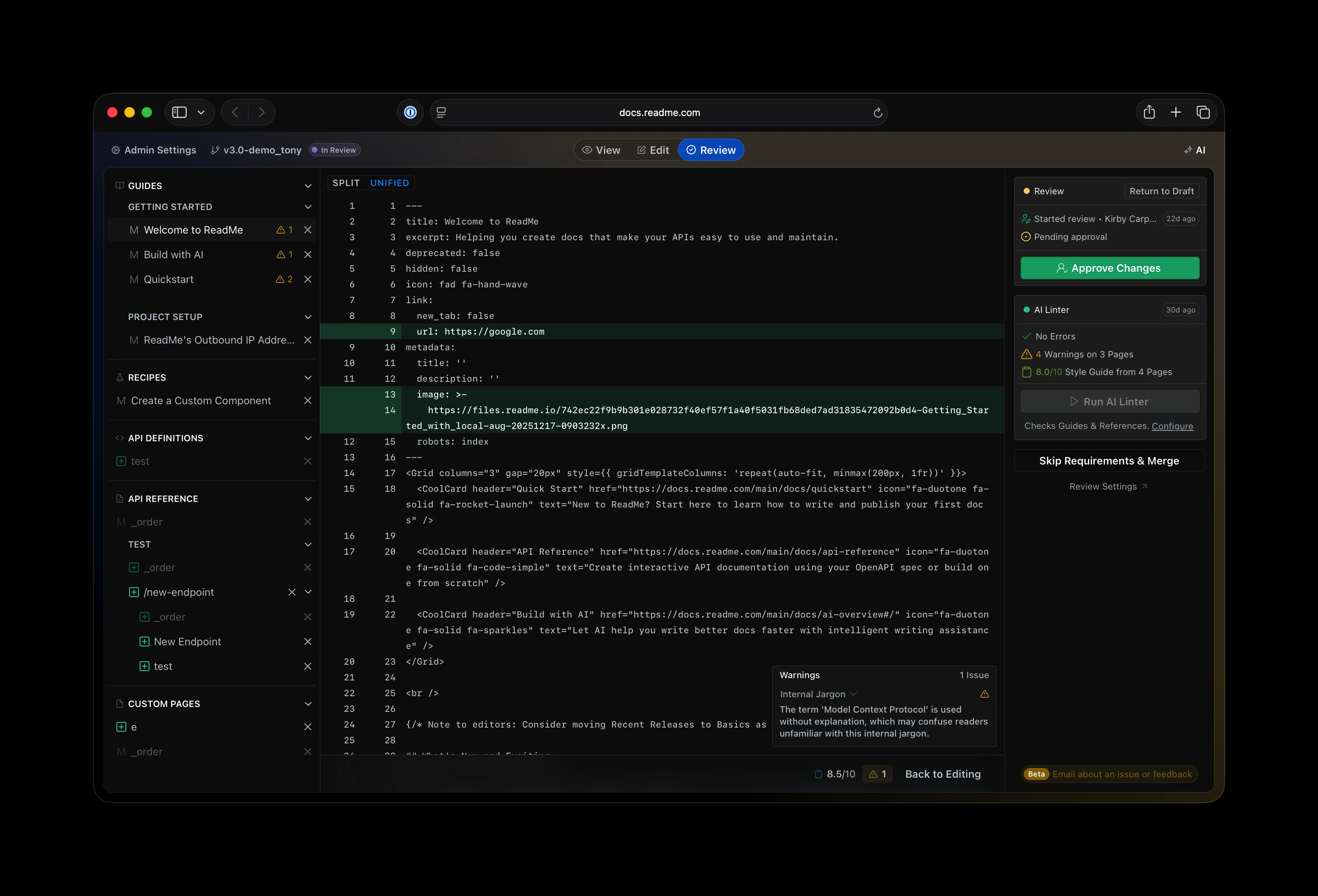 Reviews enable writers and teams to check changes with teammates and the AI Linter before they’re ultimately published. Writers can request a review from the Review tab and tag reviewers to notify them in-app and by email. Reviewers can approve changes to enable merging.