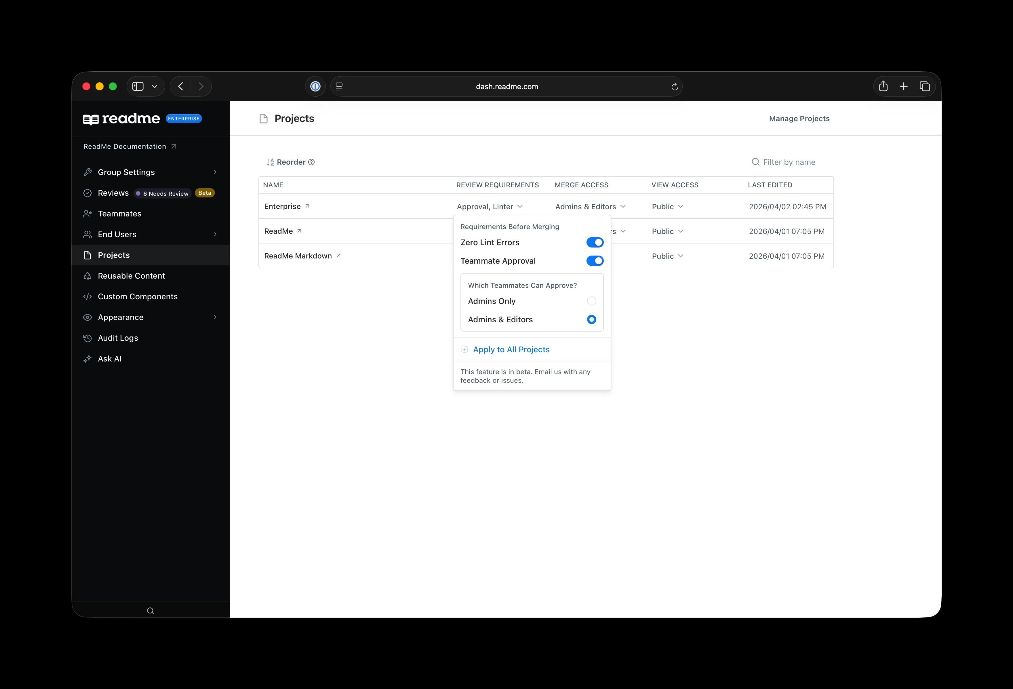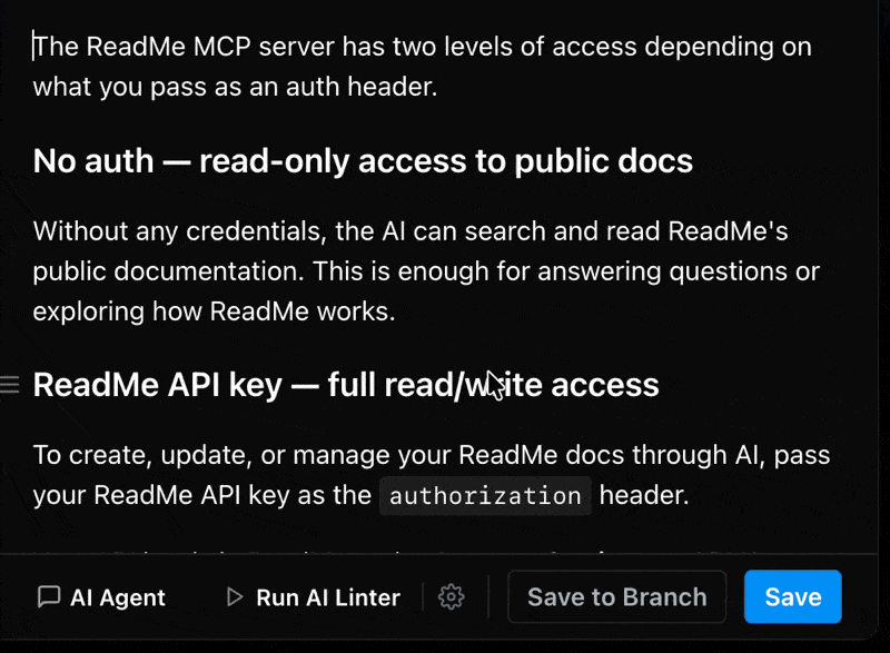 With branches, editors and admins can write without committing to publishing right away. It’s ideal for writing about feature releases, or reorganizing a section. Branches work just as well for small changes when your team prefers a review before anything goes live. If you sync with GitHub, GitLab, or Bitbucket, any branches you create will sync with ReadMe.