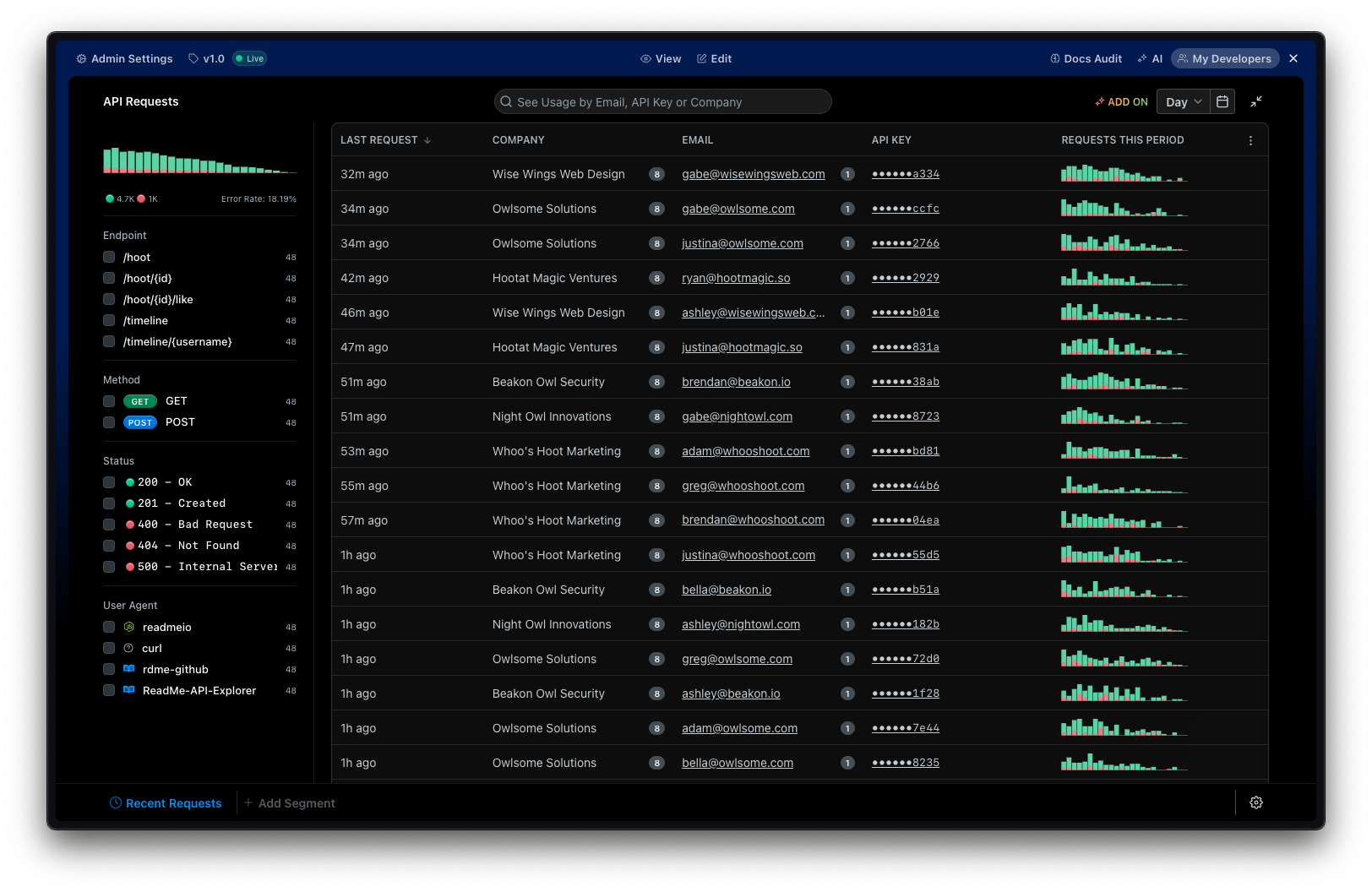 As an Admin, you also want to have insight into how your developers are using your API — to help your developers when they encounter an error, and to have analytics to share with your team. Think of the My Developers page in your ReadMe project dashboard as a behind-the-scenes look at your API users. Here’s where you can investigate API usage in detail (by API key or email) and quickly help users debug issues in their logs. Read on to learn more about setting up this page in your ReadMe project dashboard, and check out this page to learn how to get the most out of your My Developers page.