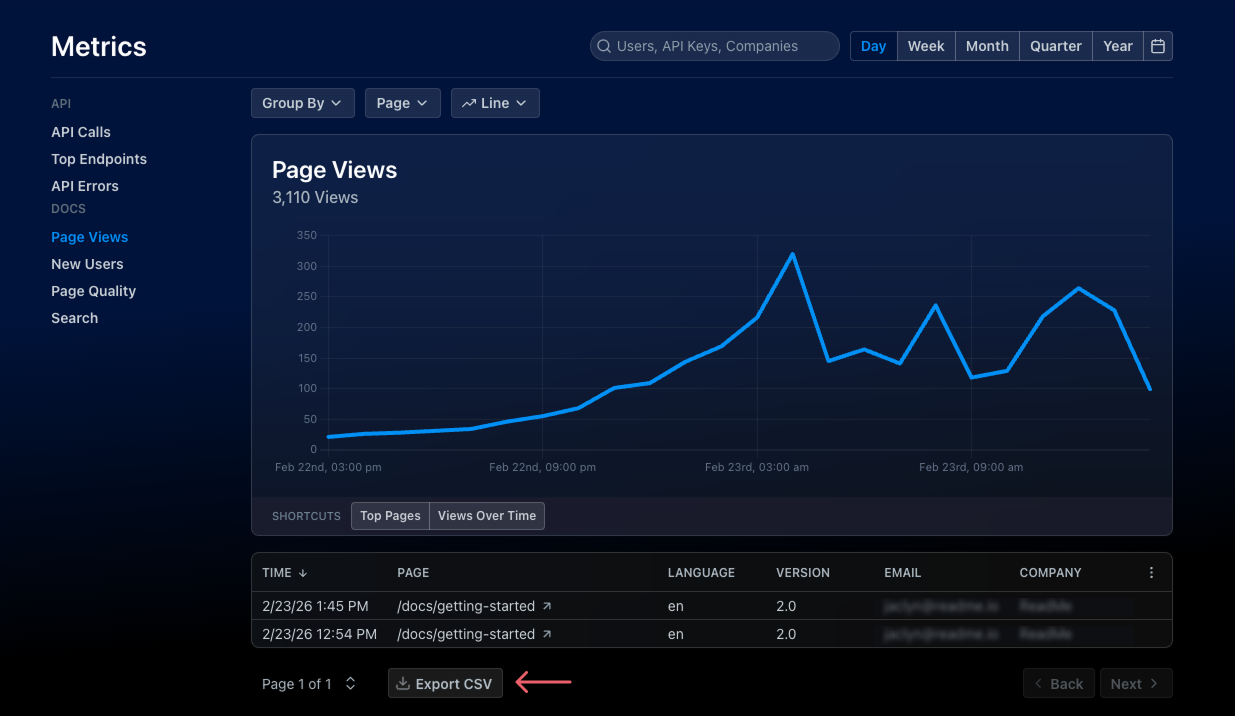Looking to dig into your ReadMe data in another tool? You can now export data across all of your project's API and Documentation Metrics!