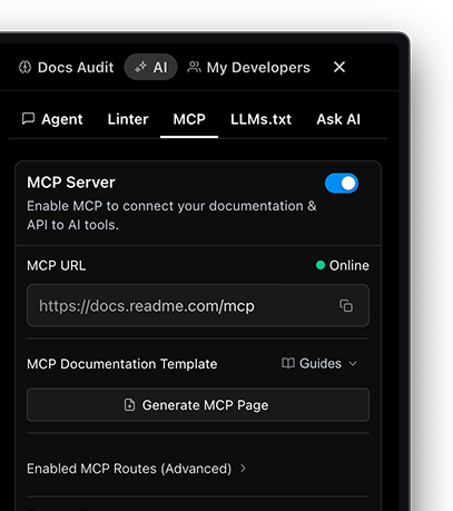 With ReadMe, every project automatically includes a fully configured MCP server. Simply enable MCP to connect your API documentation to AI tools.