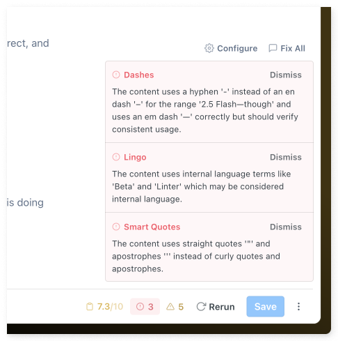 Once configured, running the Linter checks your page against your prompts. Issues can be fixed automatically using the Agent.