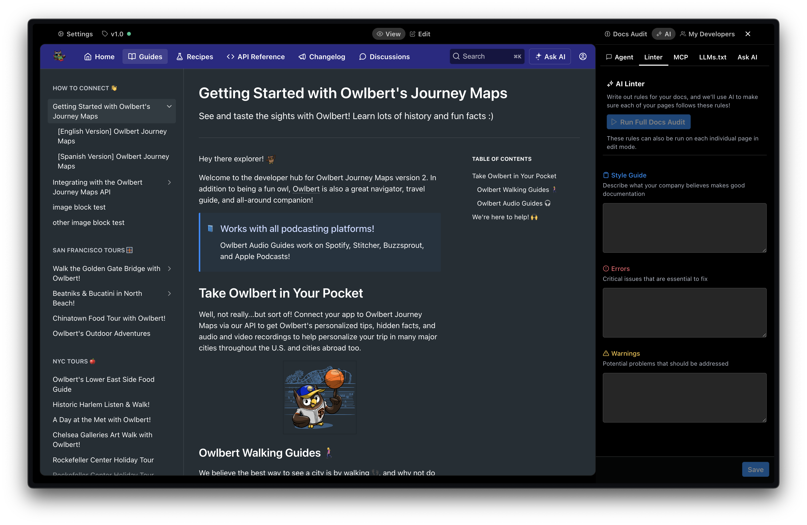 Style Guide: Write about what makes for great docs and the Linter will score your content. Example: