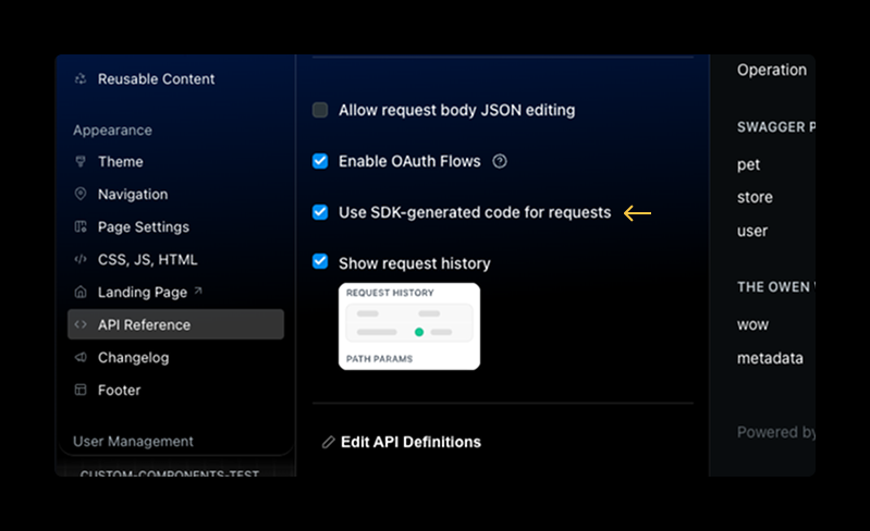 If you'd like to enable it, head to the Admin Settings > API Reference, and check the box for Use SDK-generated code for requests. If you'd like to disable this feature, uncheck the box.
