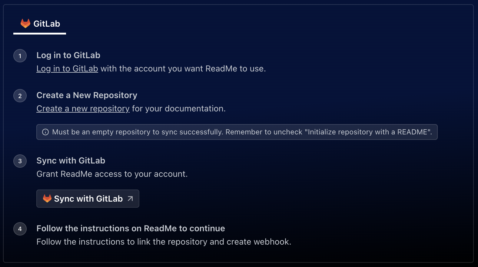 read_apifor listing projectsread_userandread_profileto display user informationread_repositoryto sync content in GitLab to ReadMewrite_repositoryto sync content in ReadMe to GitLab